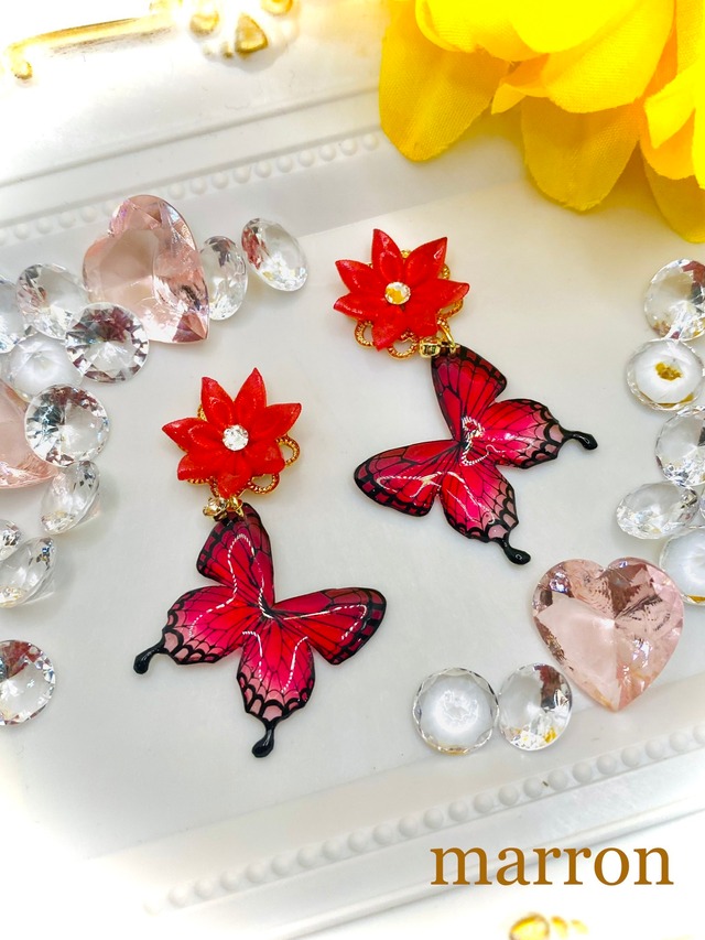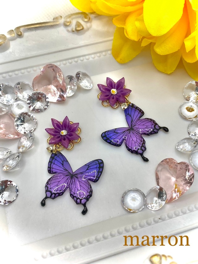 ご覧いただきありがとうございます つまみ細工のお花にヒラヒラ舞う蝶のピアスです つまみ細工はレジンでコーティングしてありますので、型崩れすることなくご使用いただけます。 一つ一つ丁寧に制作していますが、手作業のため小さな気泡が入る場合があります 予めご了承ください ピアスでの記載ですが、イヤリングにも変更出来ますので、オプションより金具の種類をお選びください Boxに入れてのお届けとなりますので、是非プレゼントにもご活用ください ※お使いのモニターにより色味が異なる場合があります※ 蝶々:2.5cm×2.5cm お花:1.5cm×1.5cm