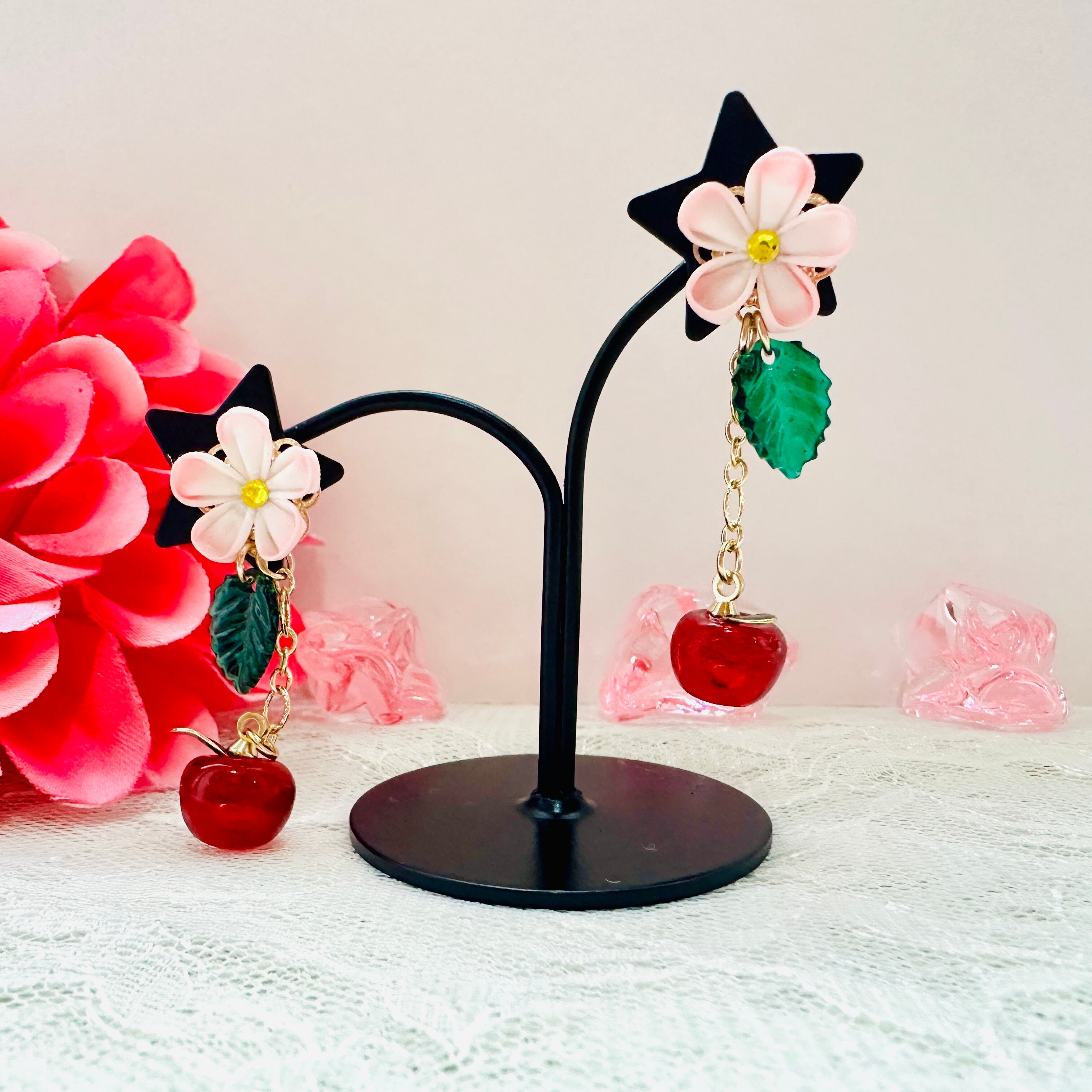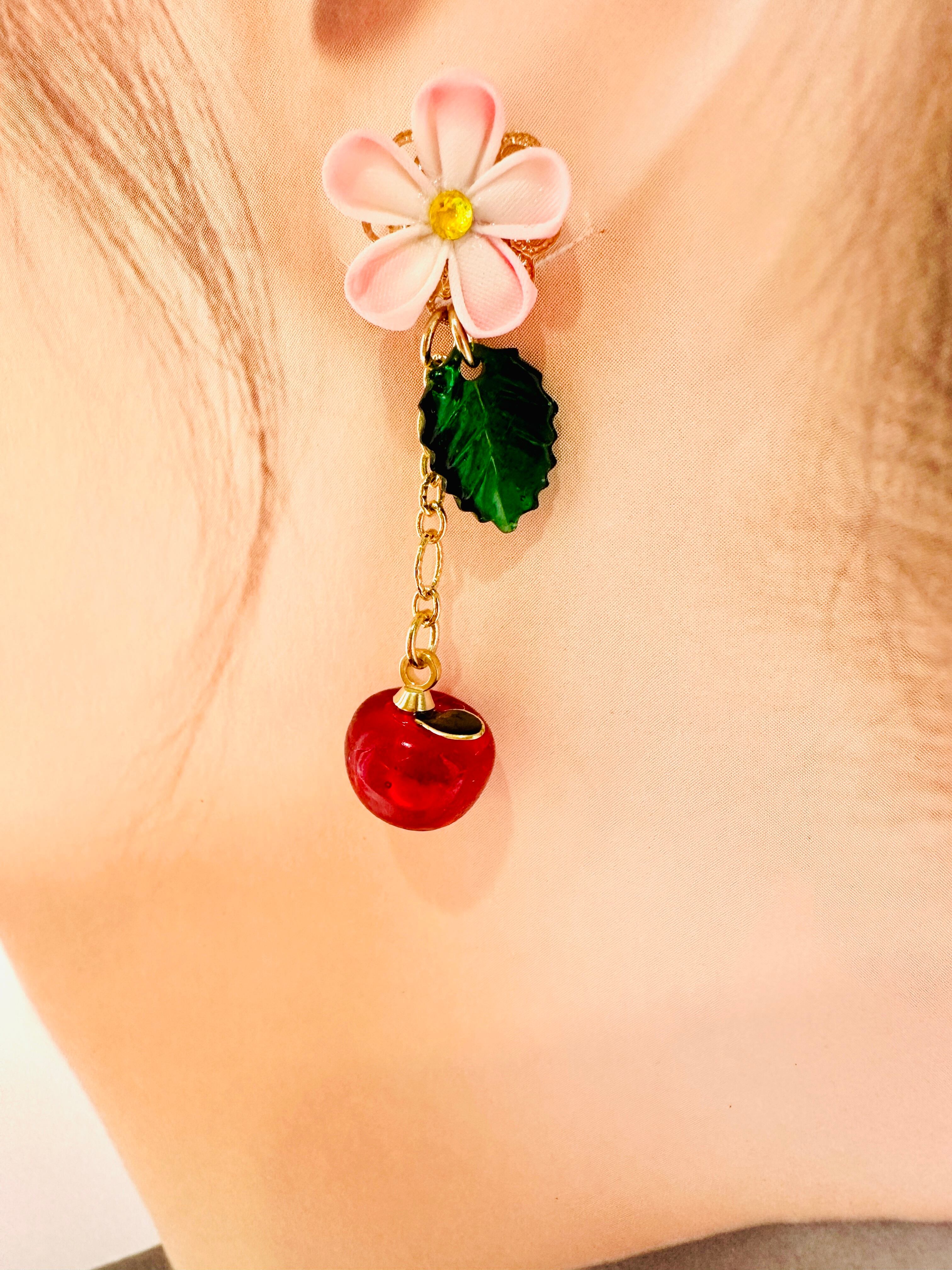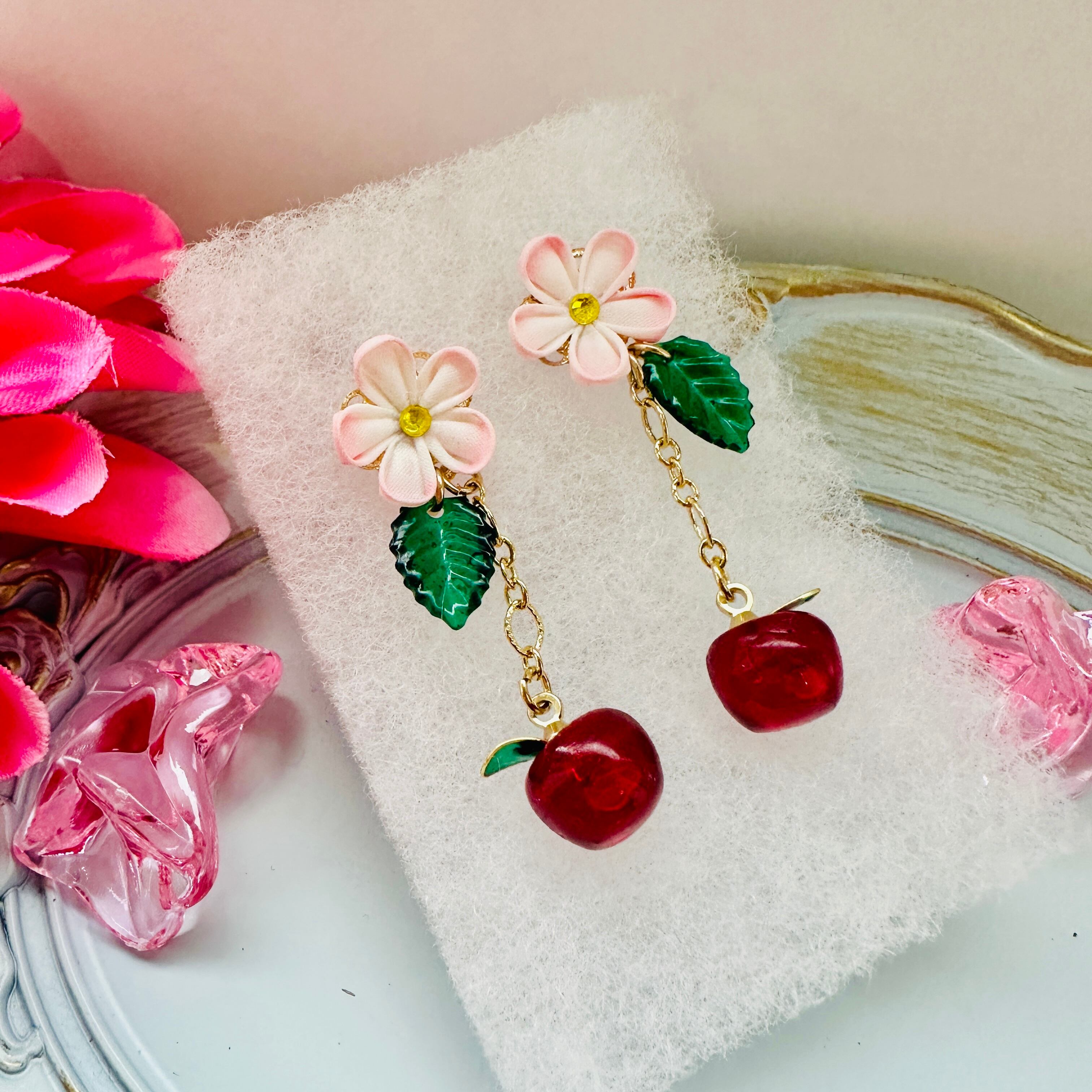 林檎とお花をモチーフにしたピアス/イヤリングです。愛らしい林檎と華やかなお花が揺れ動き、お顔周りを明るく彩ります。フレッシュさを感じるデザインに仕上げました。