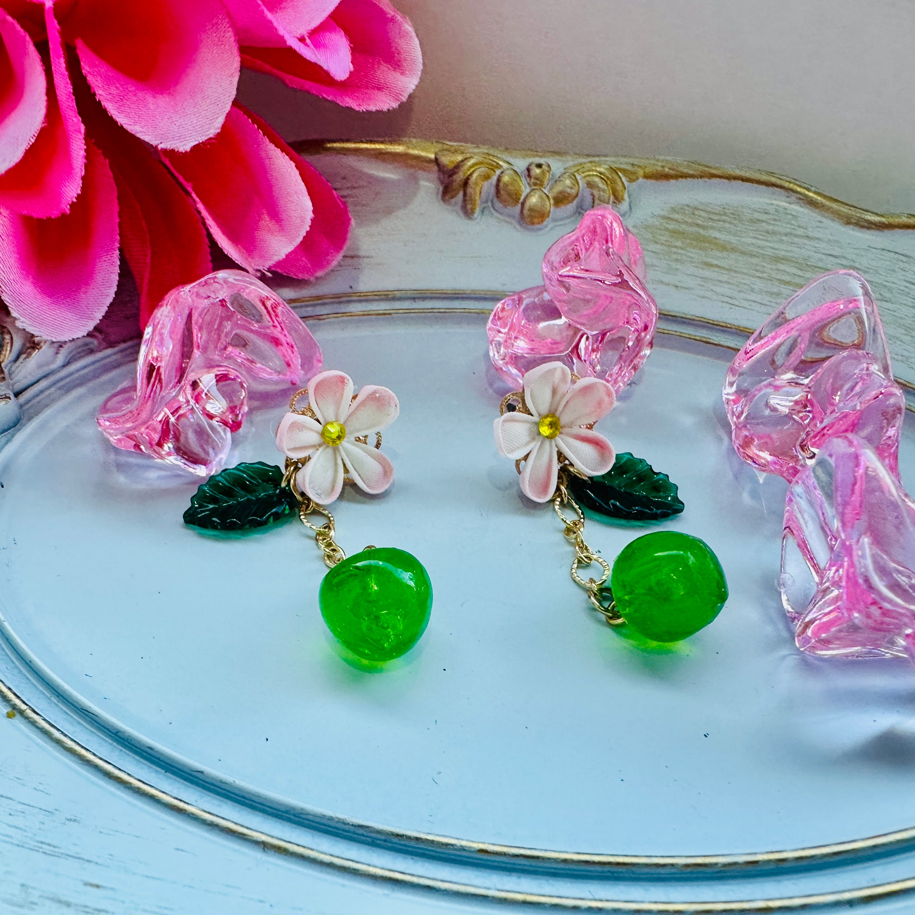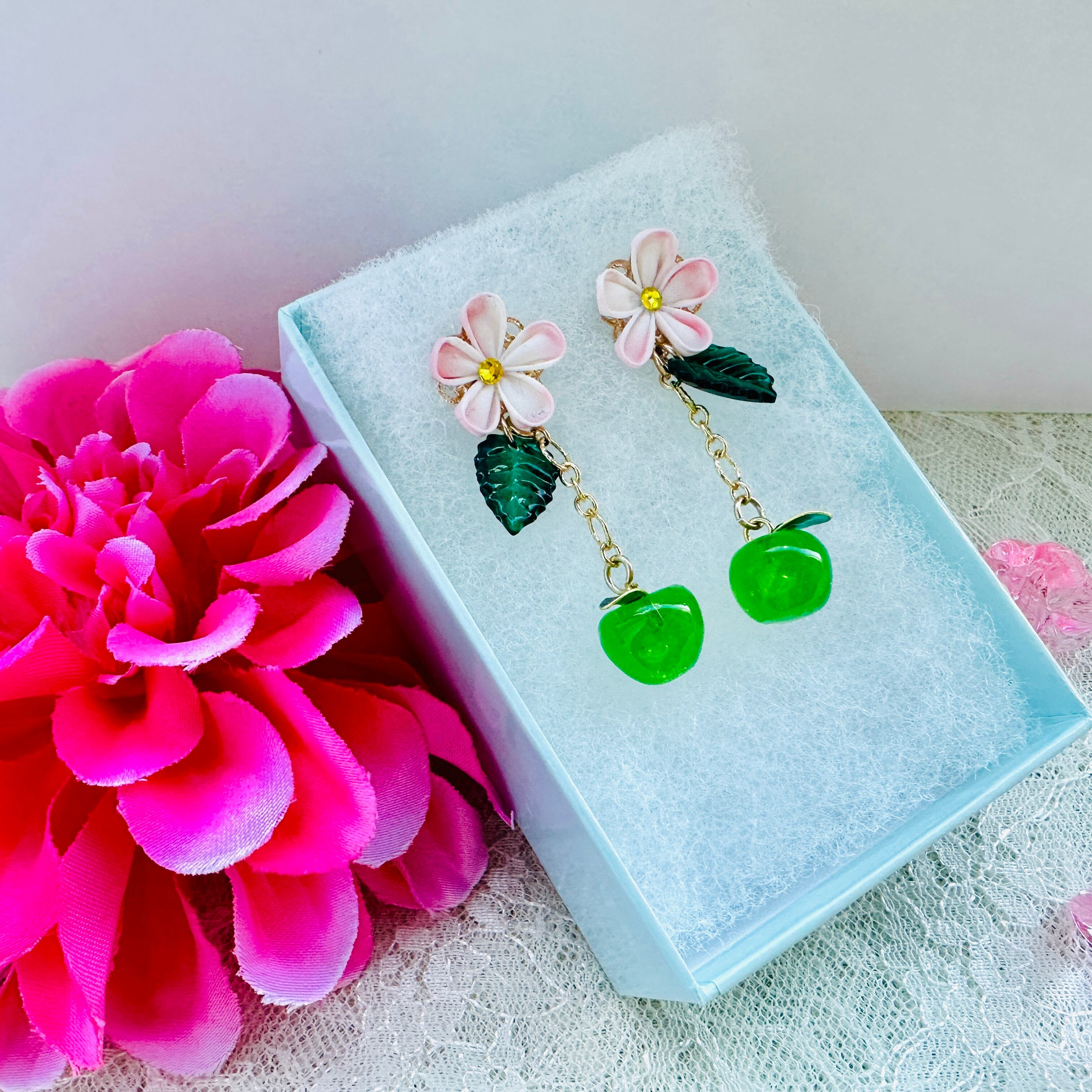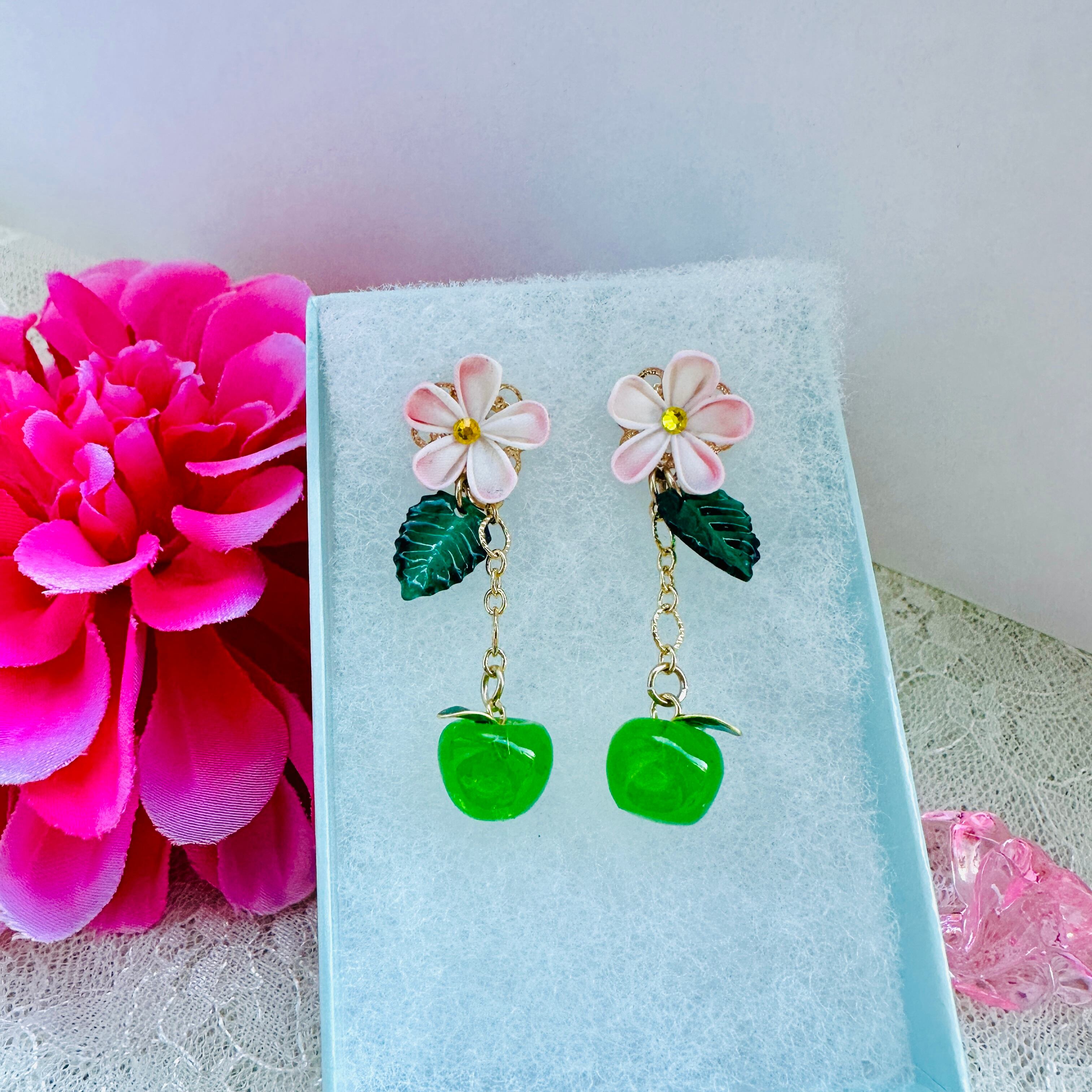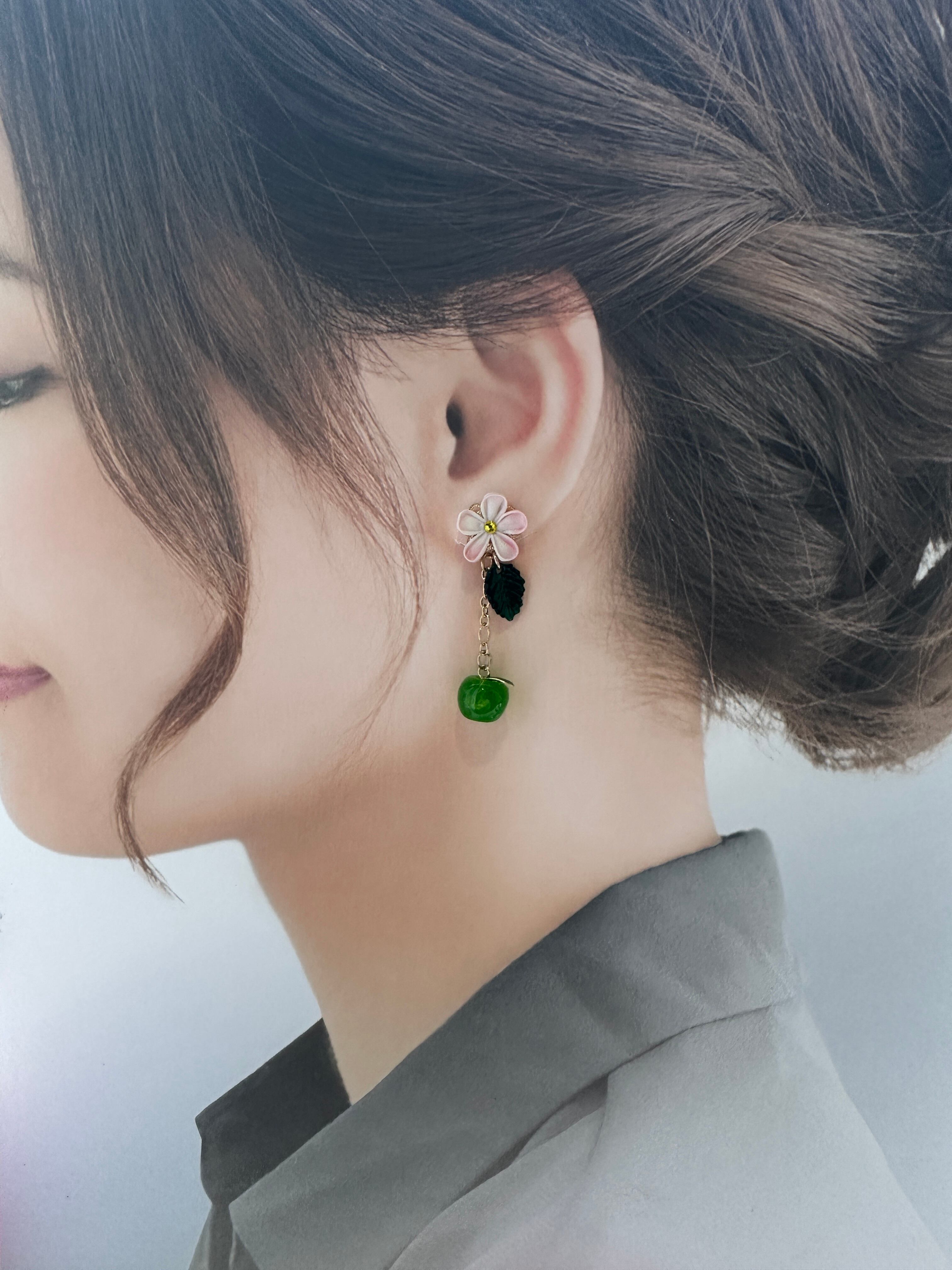 青林檎とお花をモチーフにしたピアス/イヤリングです。爽やかな青林檎が揺れ動き、明るく華やかな印象を与えます。夏の清々しさを感じさせるデザインに仕上げました。