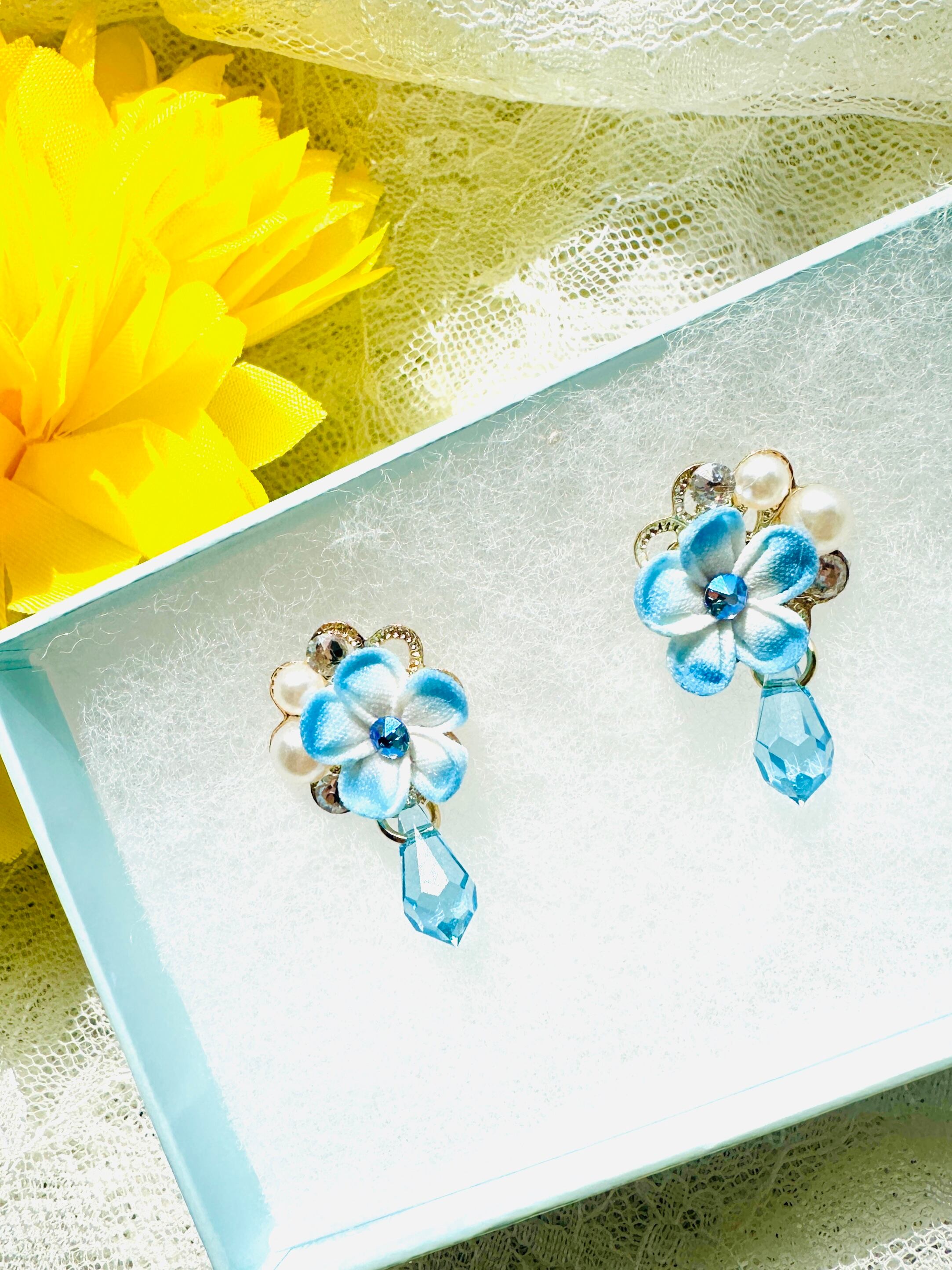 ピアス表記ですが、イヤリングへの変更も承っております。丁寧に手作業で仕上げたつまみ細工は、しっかりとコーティング処理されており、型崩れの心配なく安心してご使用いただけます。
