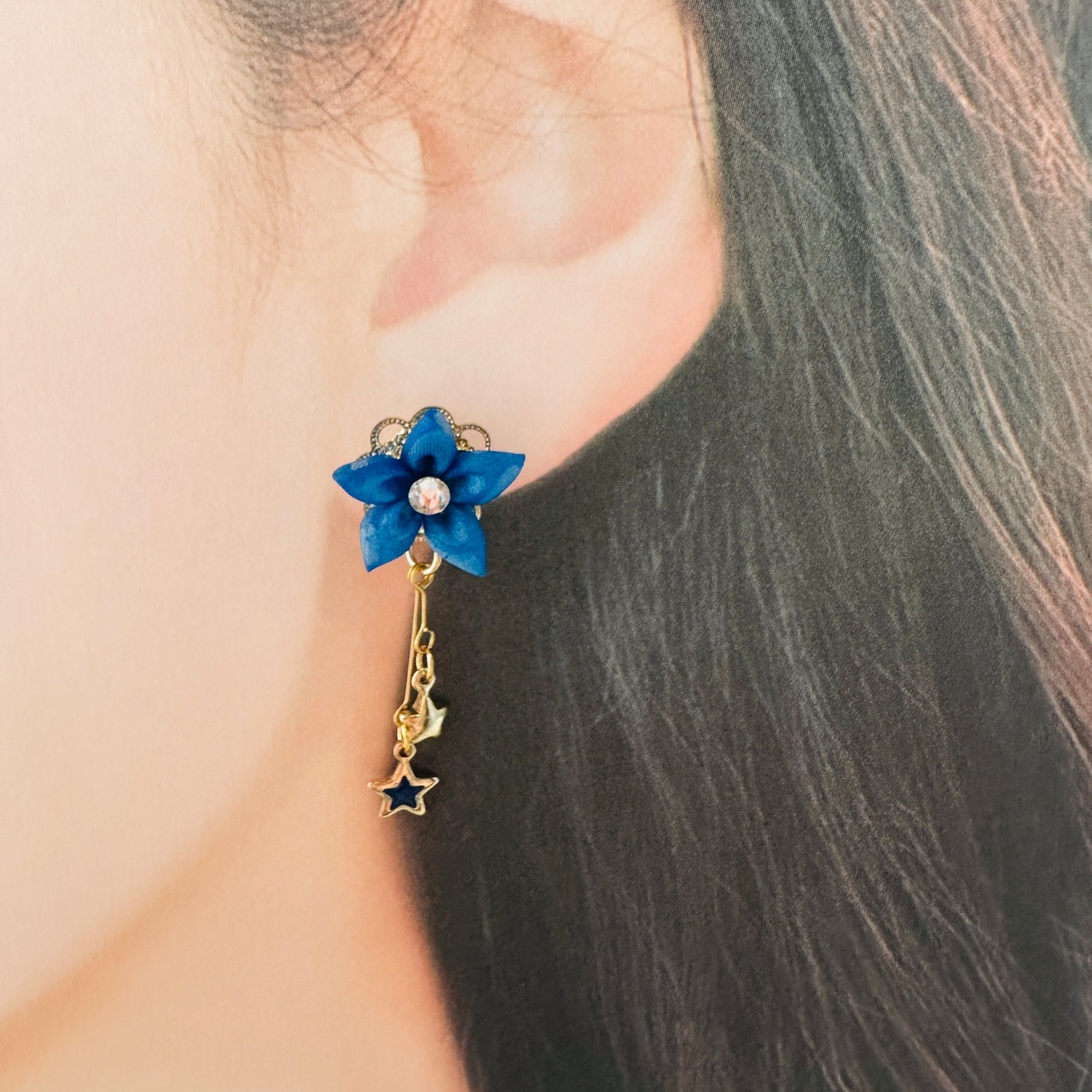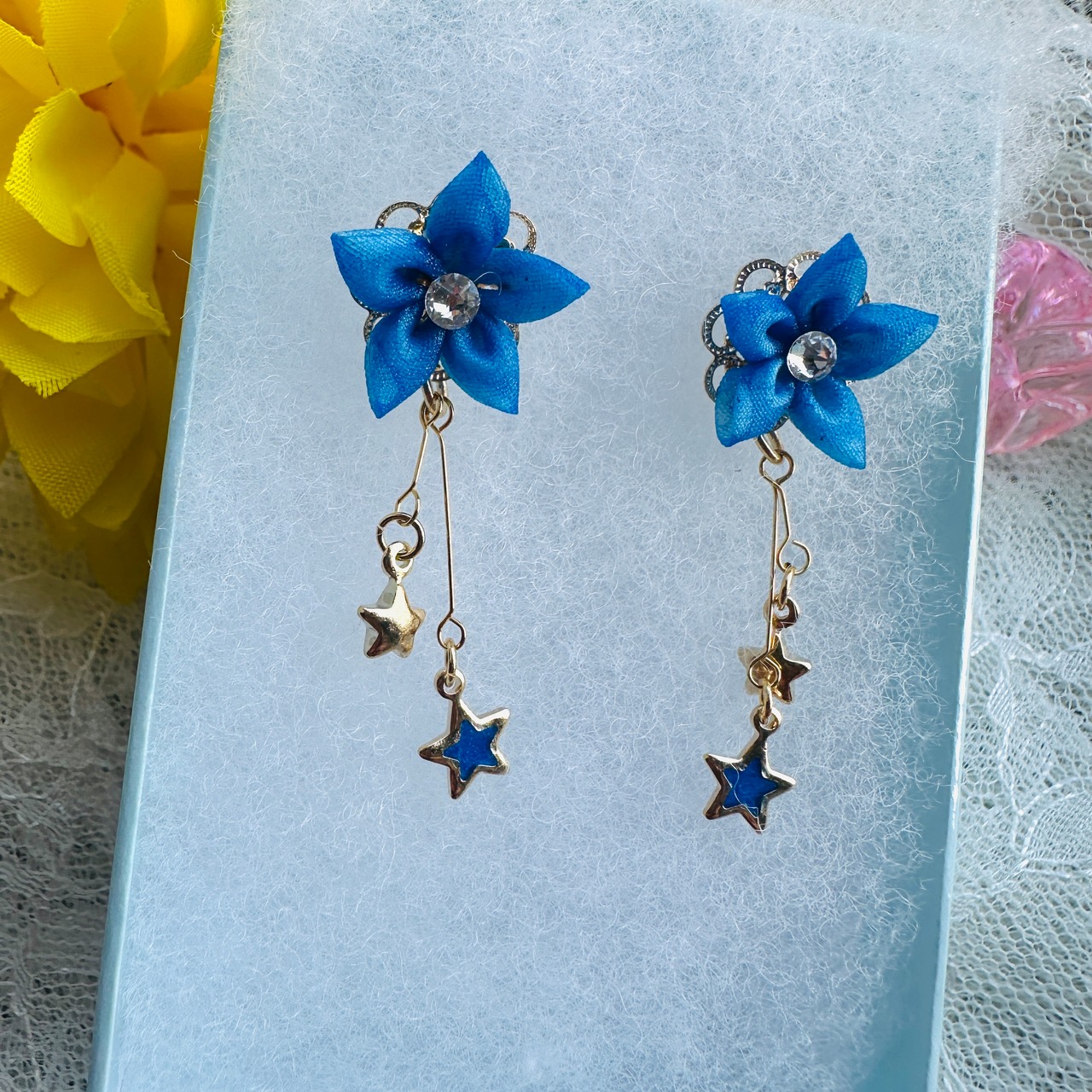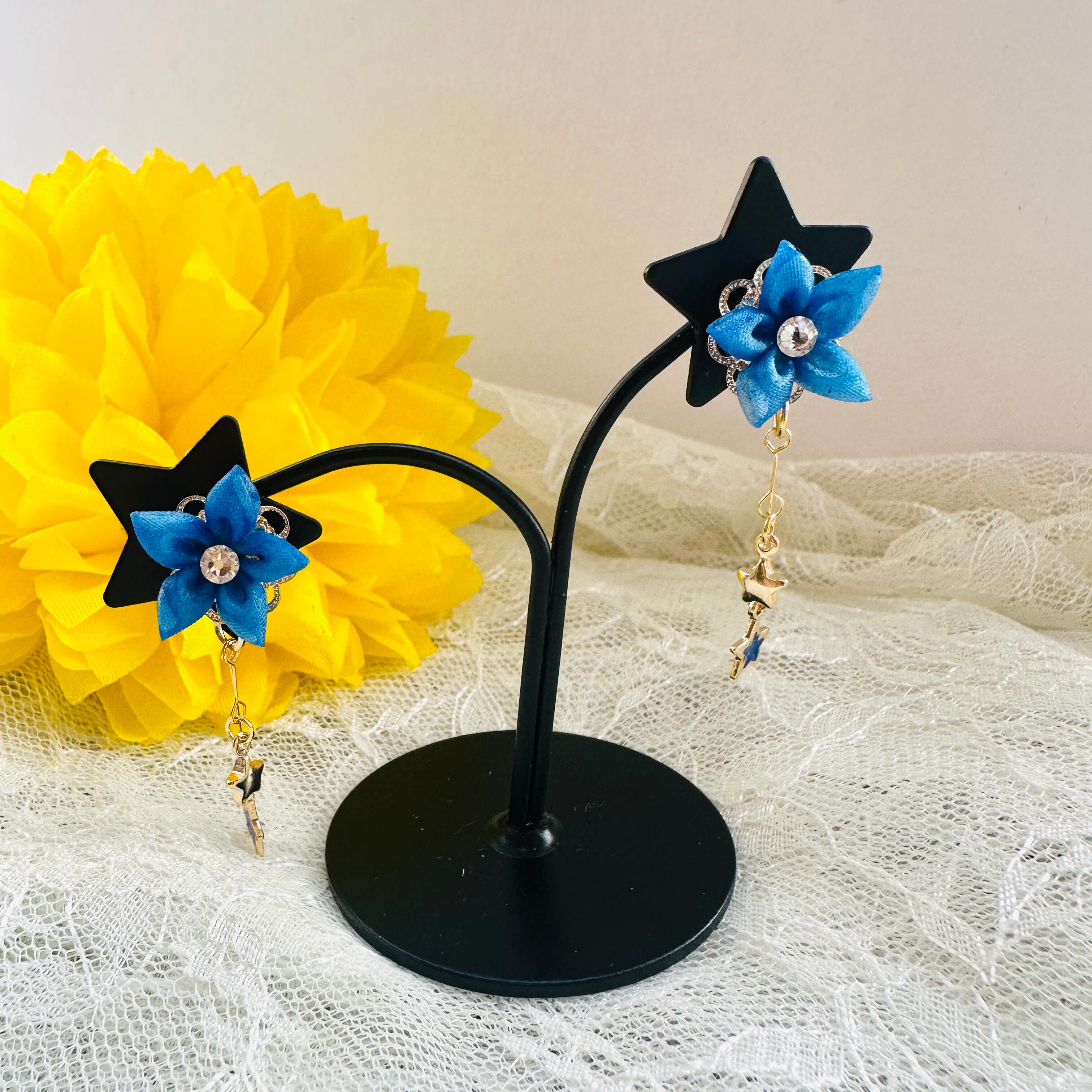 ピアス表記ですが、イヤリングへの変更も承っております。丁寧に手作業で仕上げたつまみ細工は、しっかりとコーティング処理されており、型崩れの心配なく安心してご使用いただけます。