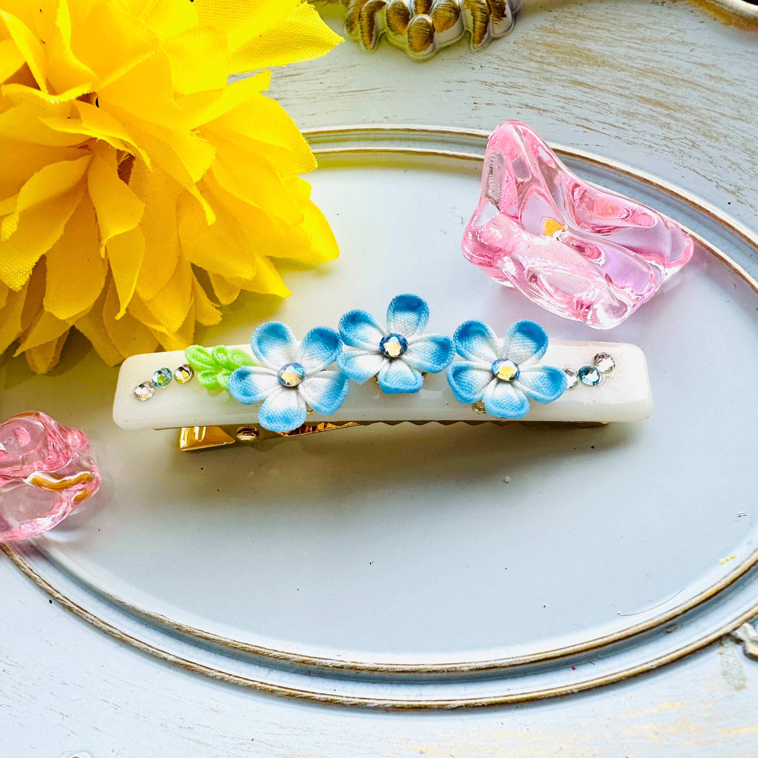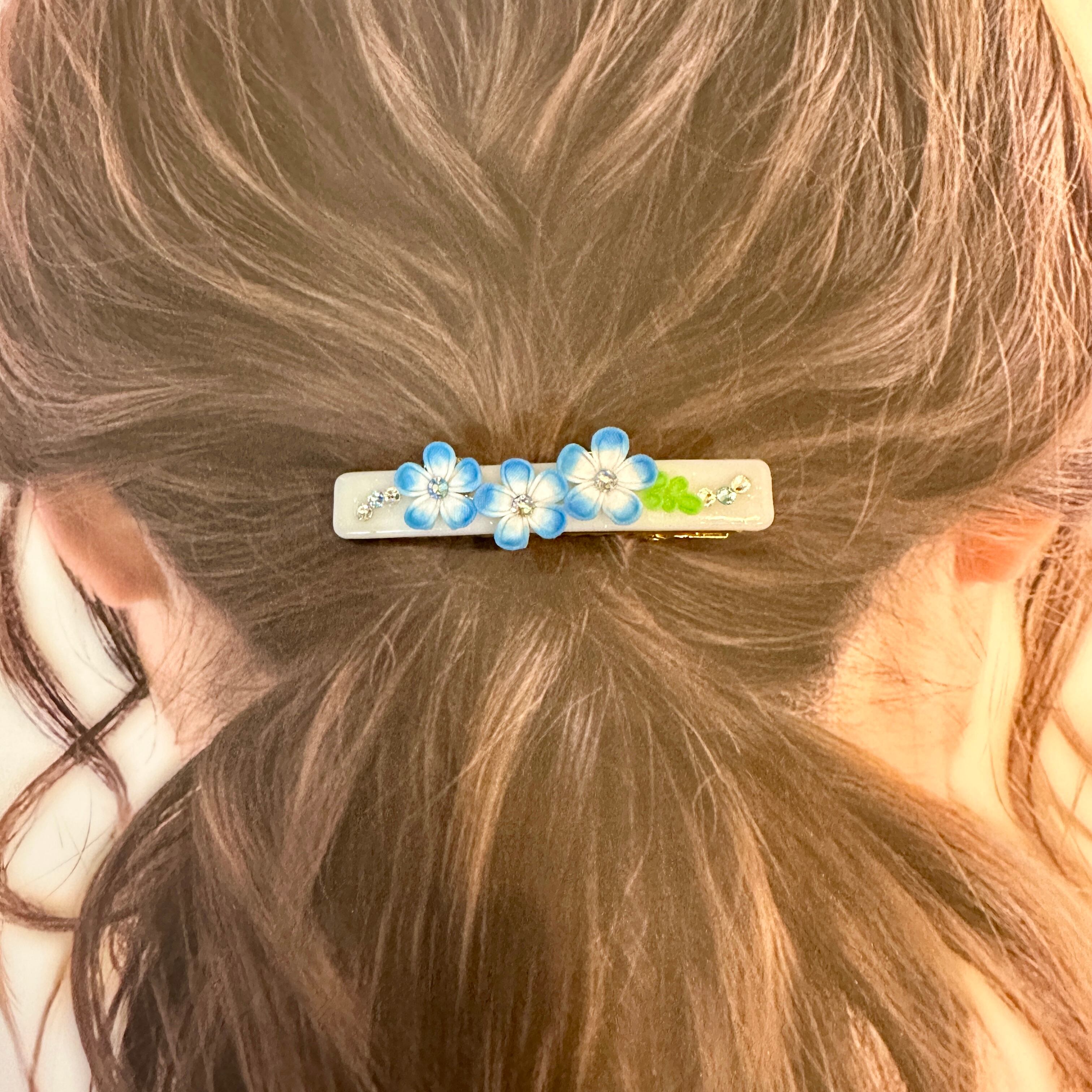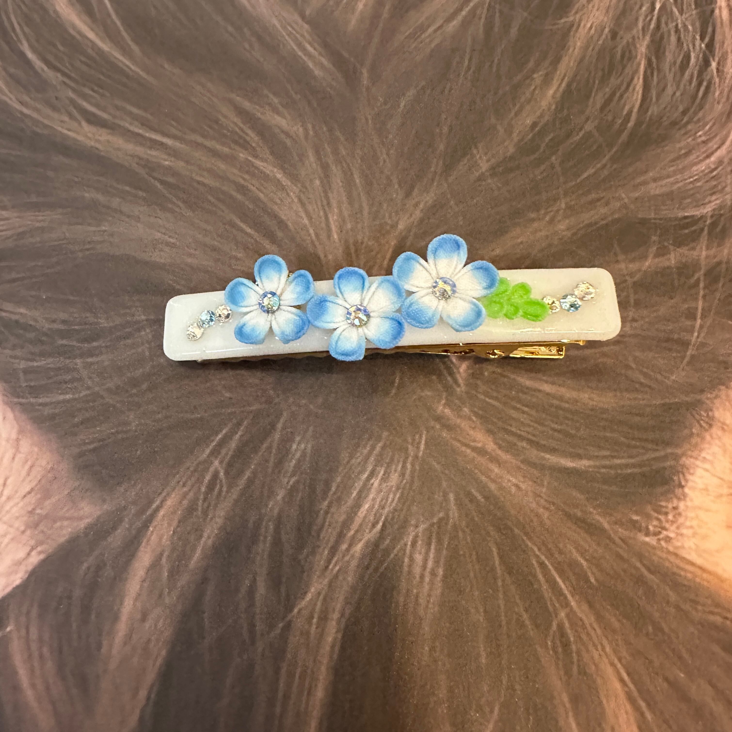 つまみ細工で仕立てたネモフィラのヘアクリップです。可憐に揺れるネモフィラの花が、髪にさわやかさを添え、穏やかな印象を与えます。春の明るい日差しを感じさせるデザインに仕上げました。