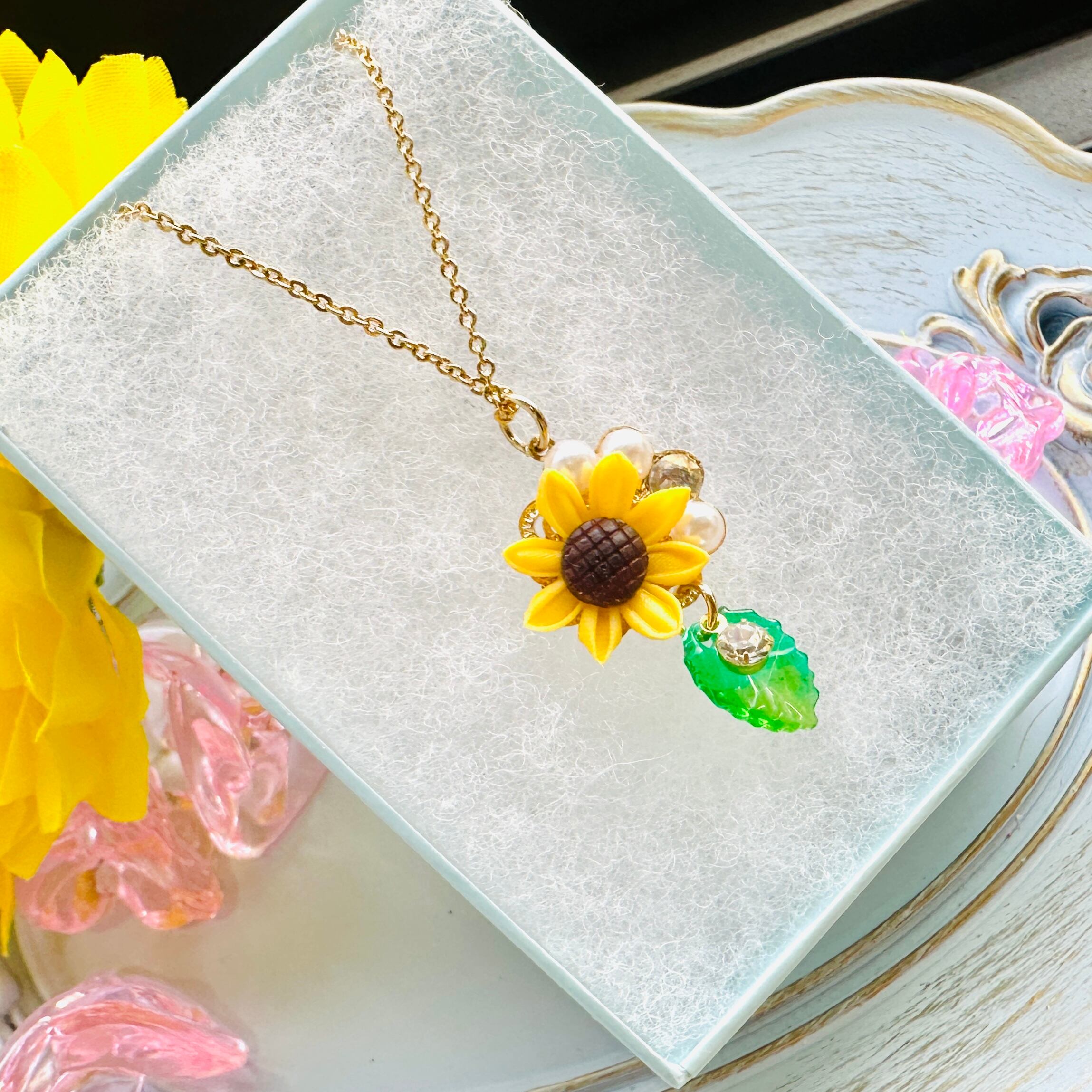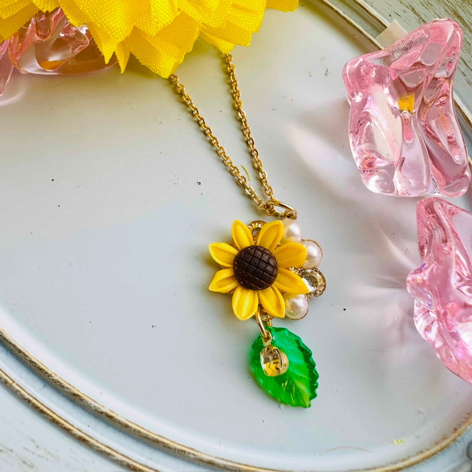 つまみ細工で仕立てたひまわりのネックレスです。鮮やかに咲き誇るひまわりが、首元に明るさを添え、元気で活力あふれる印象を与えます。夏の太陽を思わせるデザインに仕上げました。