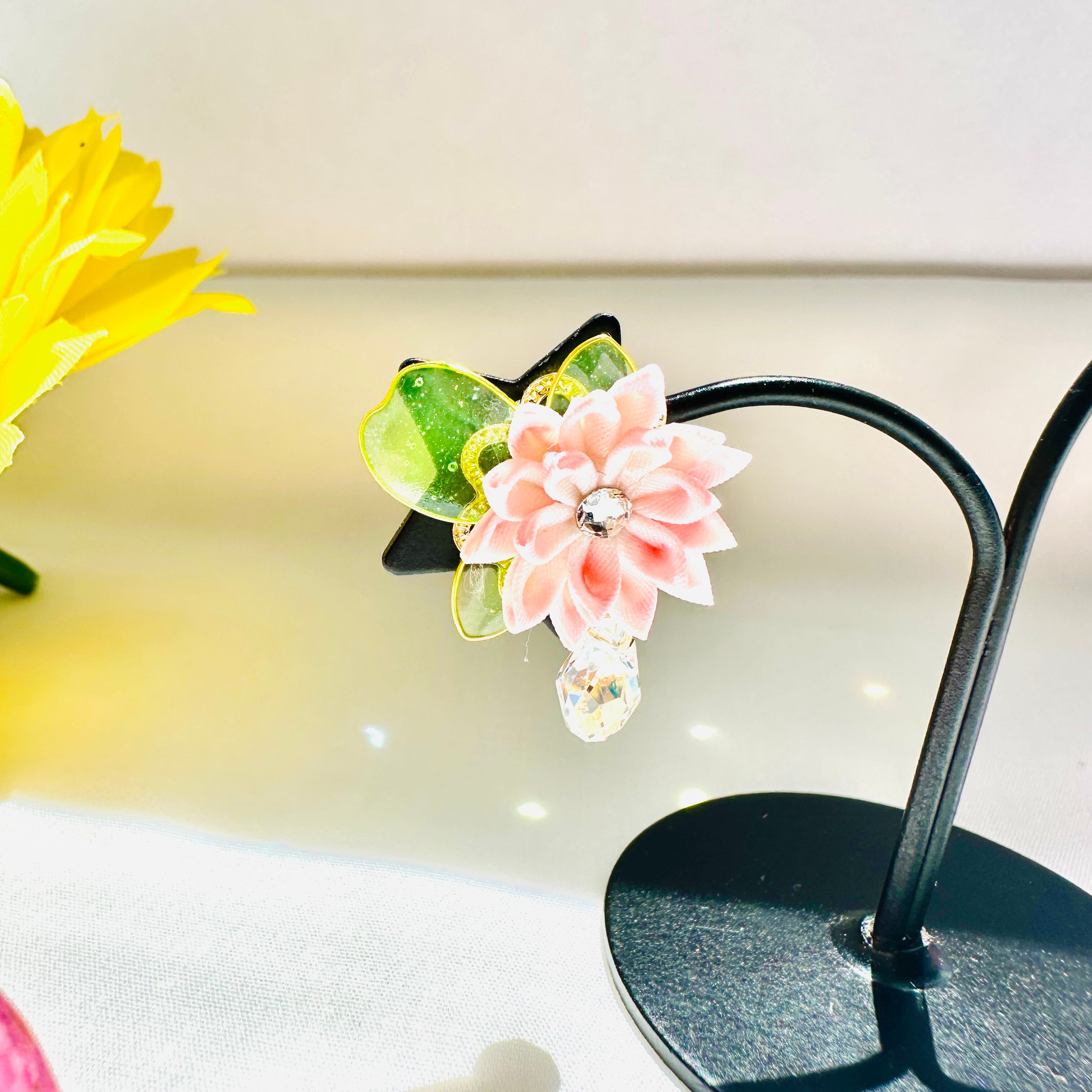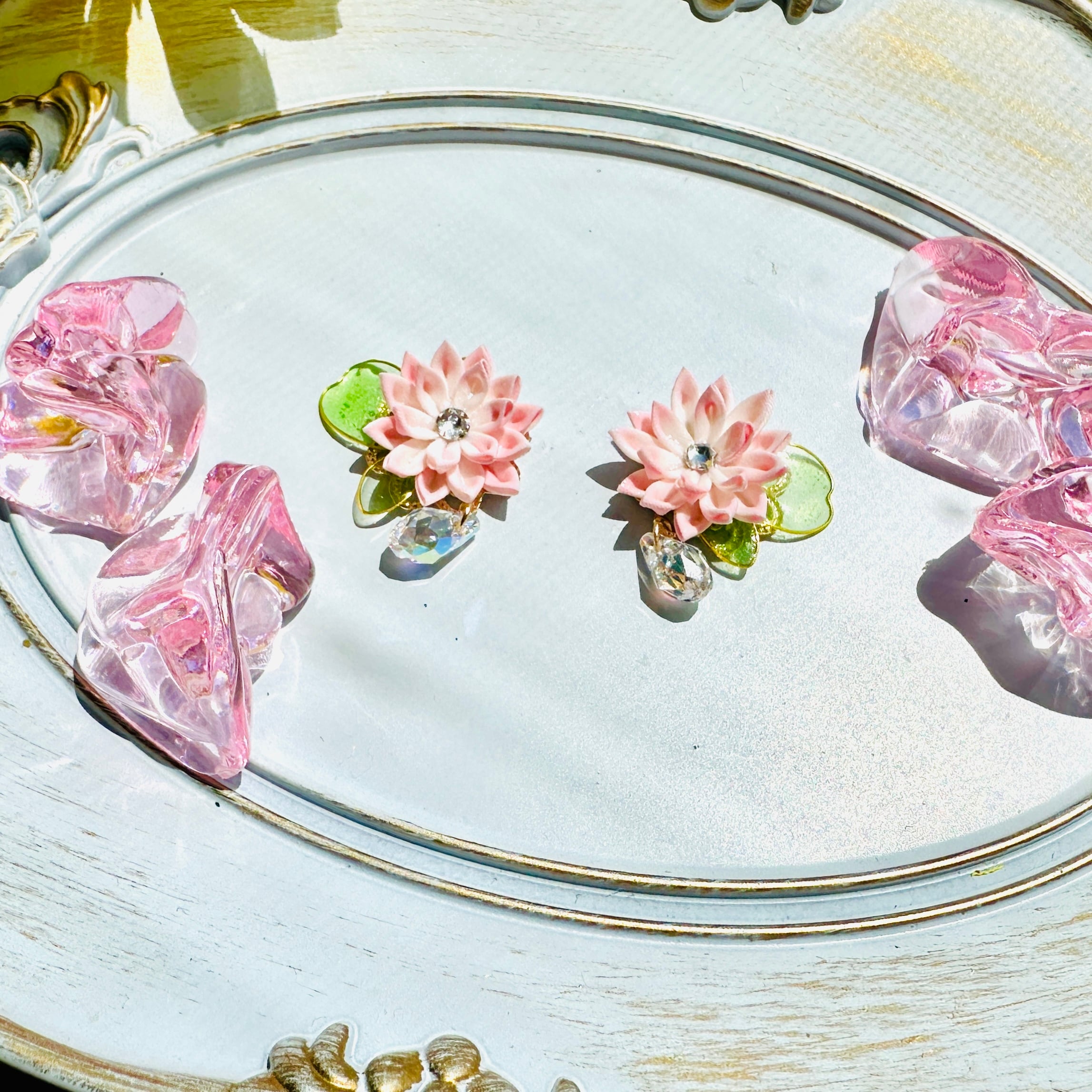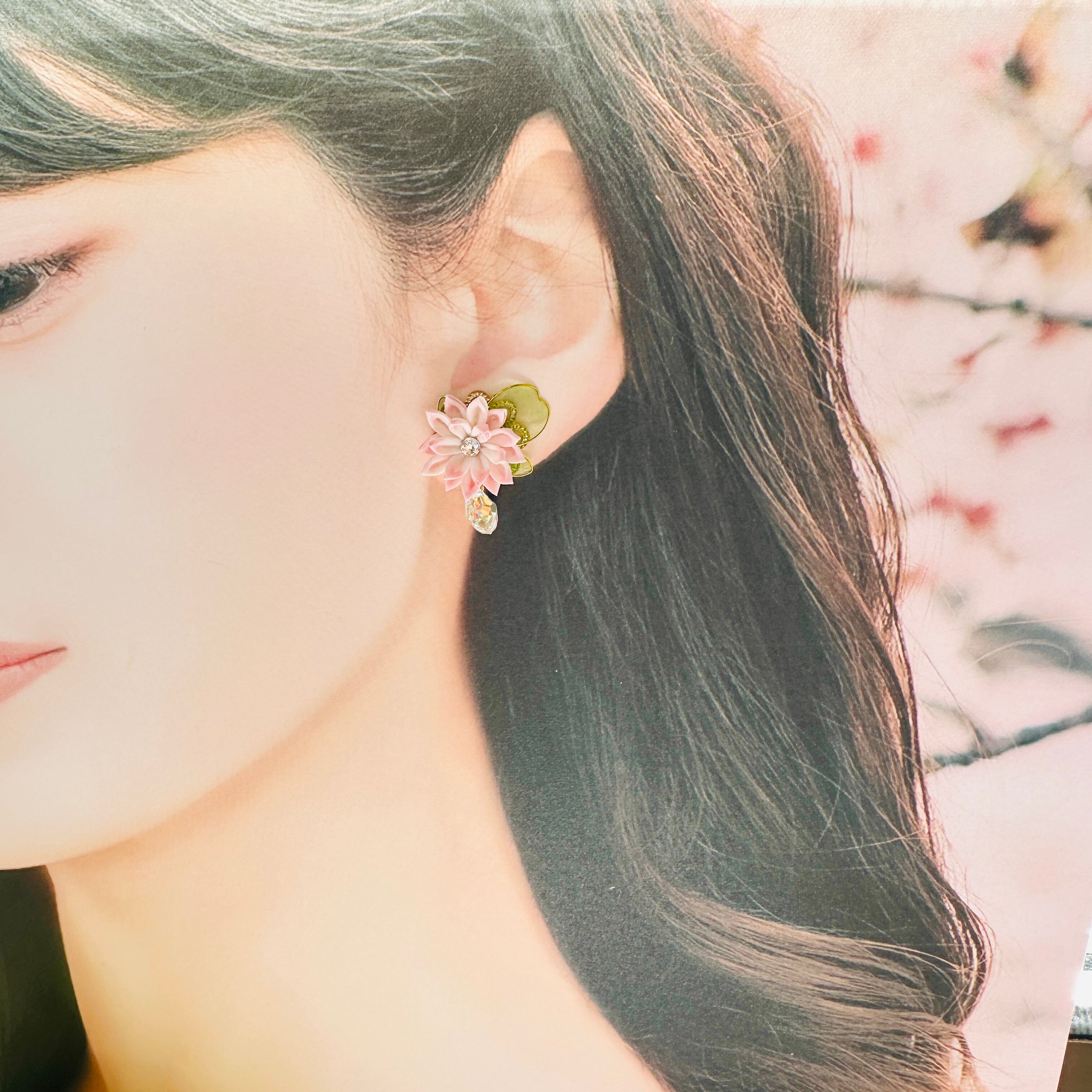 つまみ細工で仕立てた蓮華のピアス/イヤリングです。美しく咲く蓮華の花が、耳元に華やかさを添え、上品で優雅な印象を与えます。夏の清涼感を感じさせるデザインに仕上げました。
