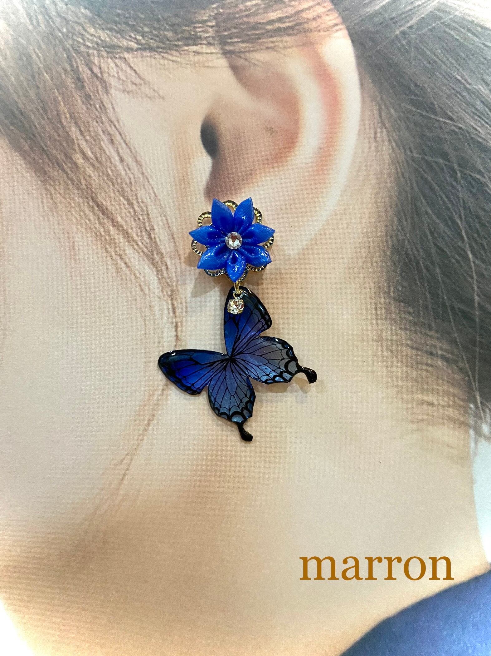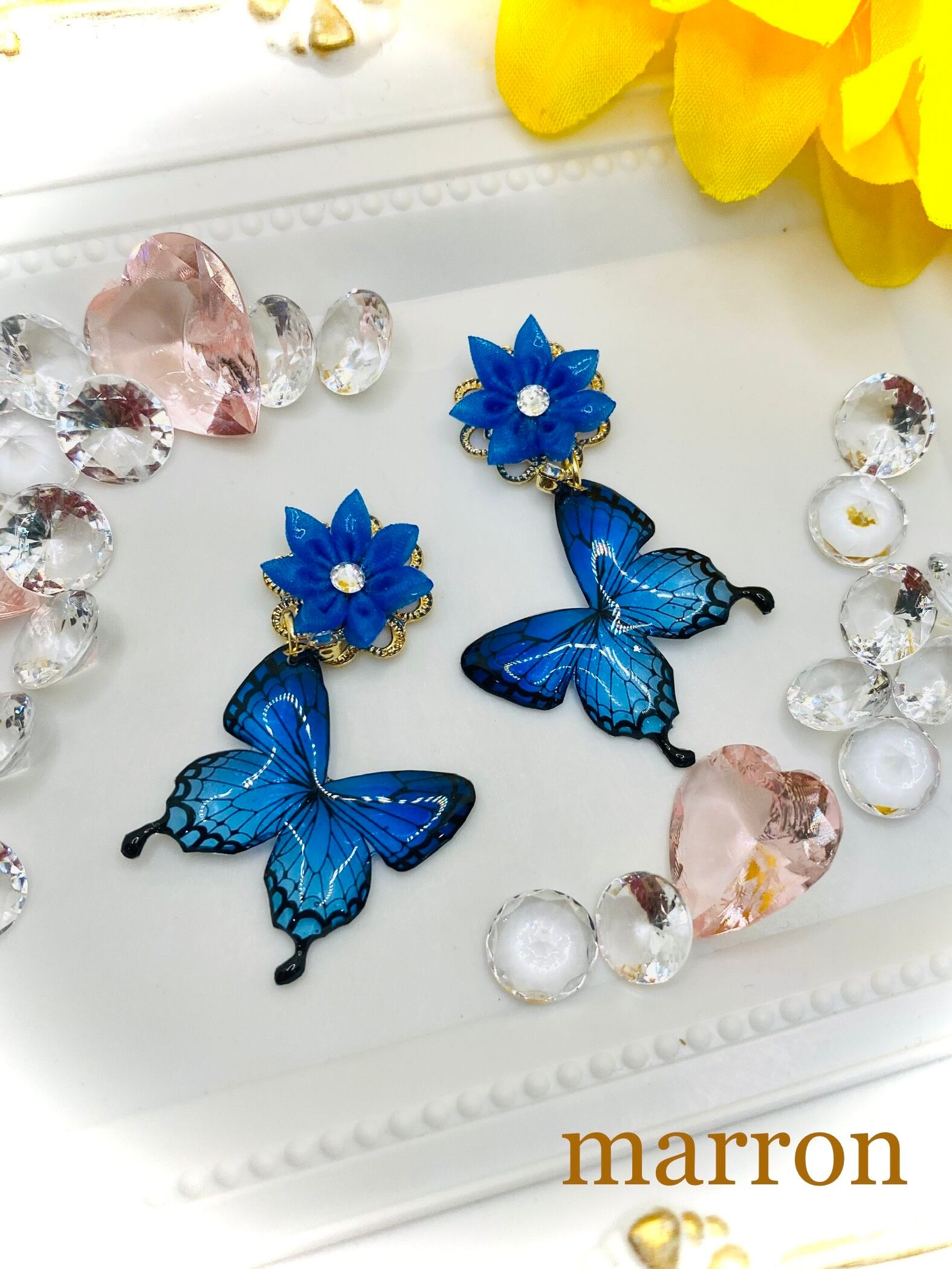 つまみ細工のお花にヒラヒラ舞う蝶のピアスです