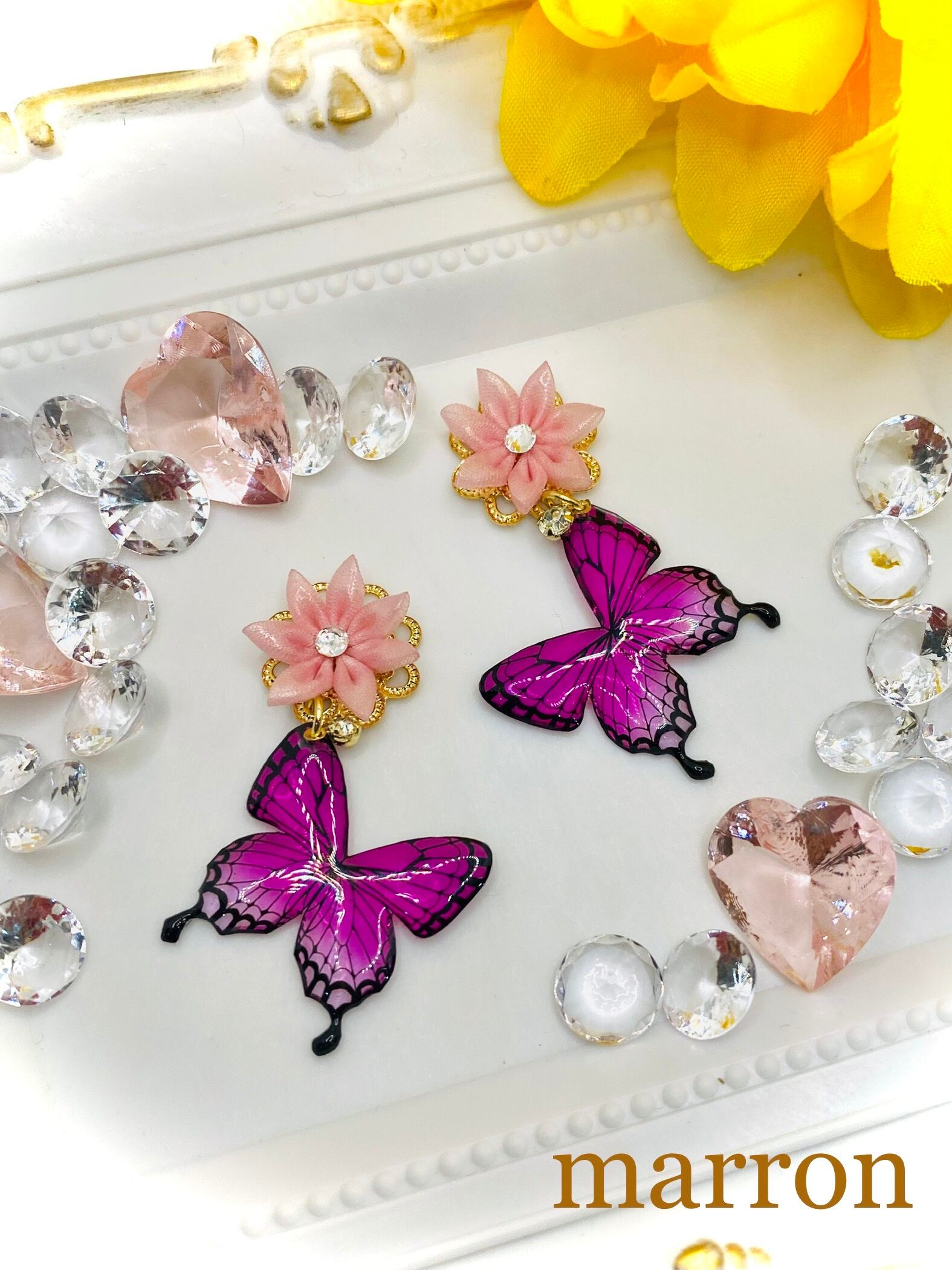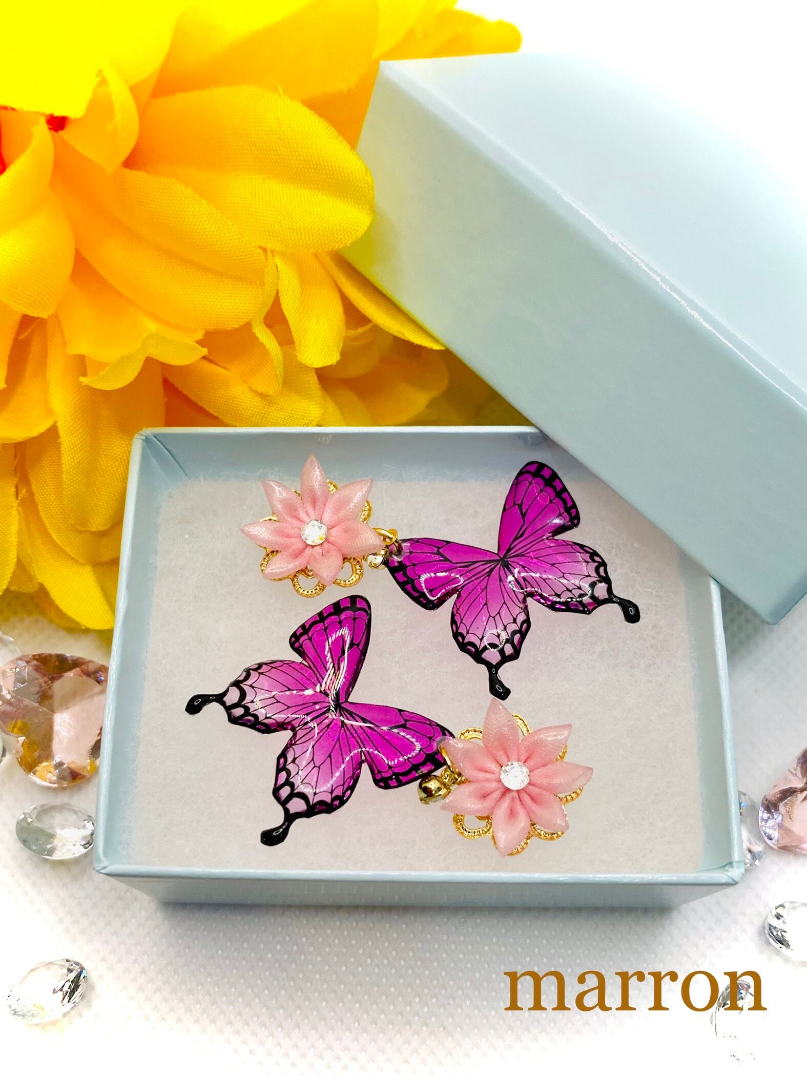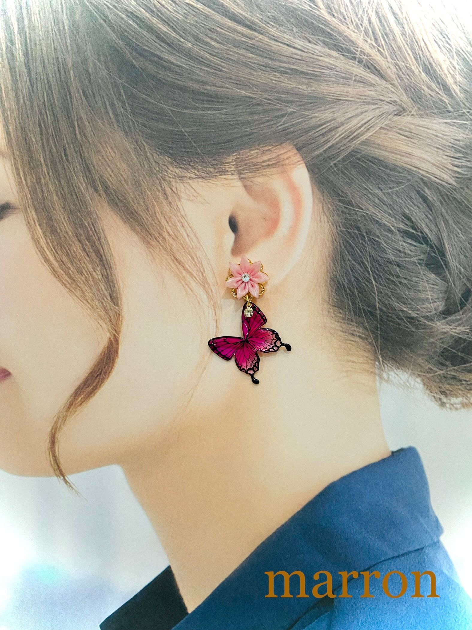 つまみ細工のお花にヒラヒラ舞う蝶のピアスです