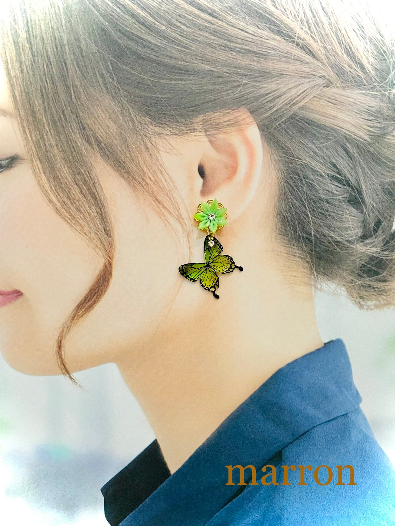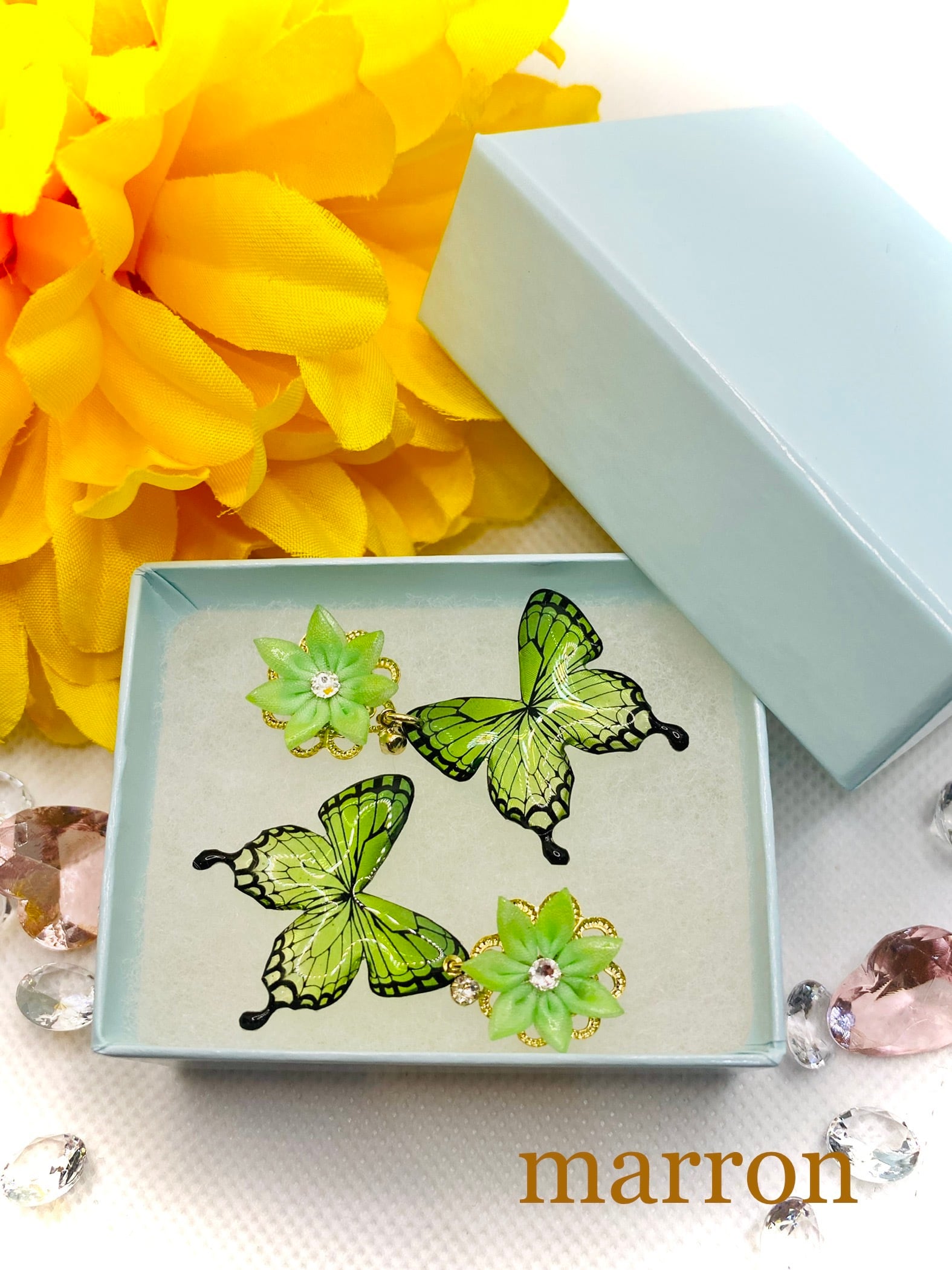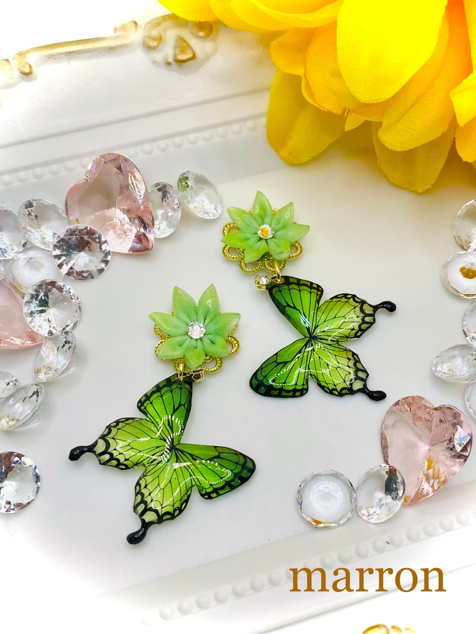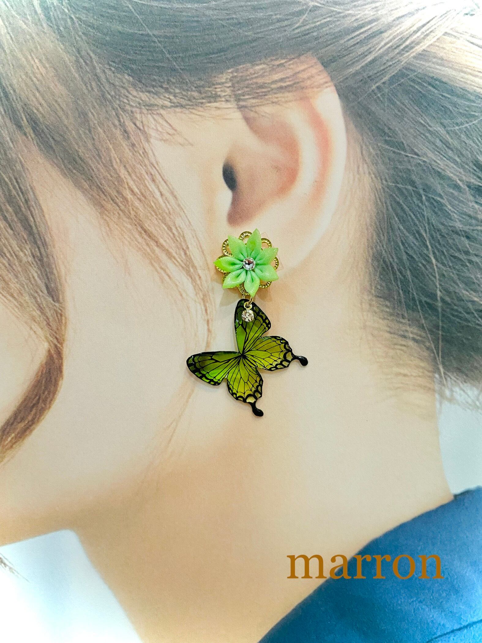 つまみ細工のお花にヒラヒラ舞う蝶のピアスです