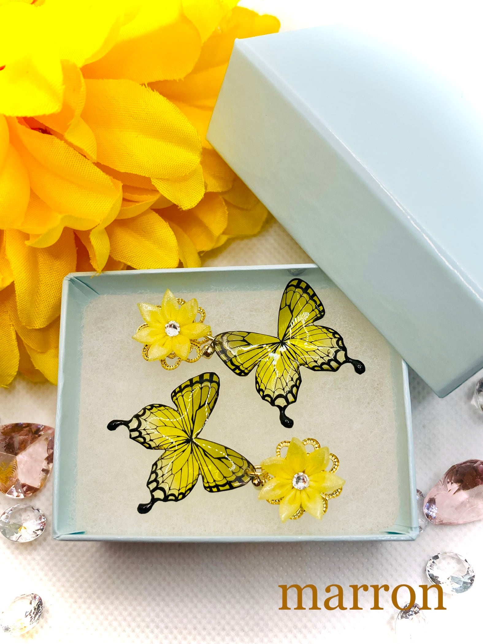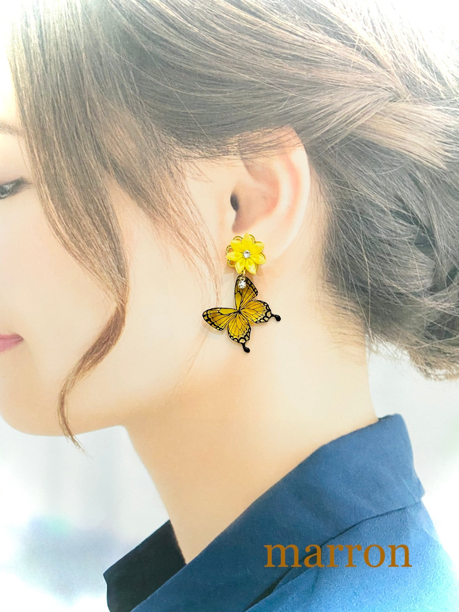 つまみ細工のお花にヒラヒラ舞う蝶のピアスです