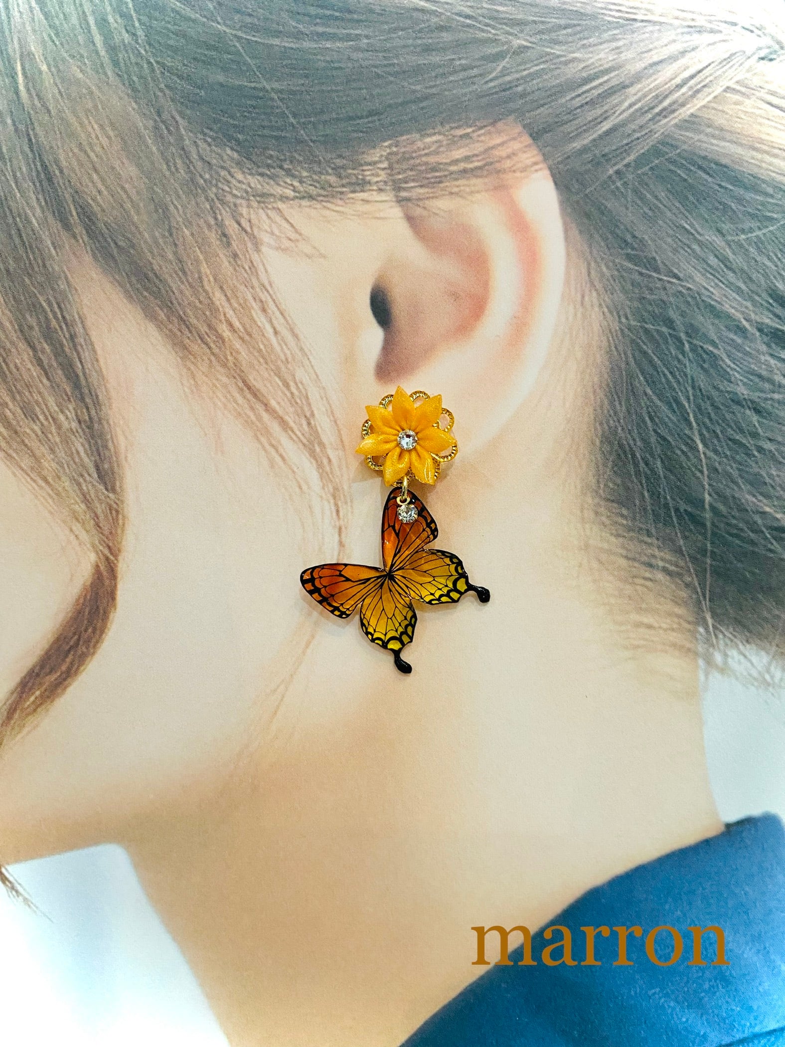 お花と揺らめく蝶のピアス オレンジ