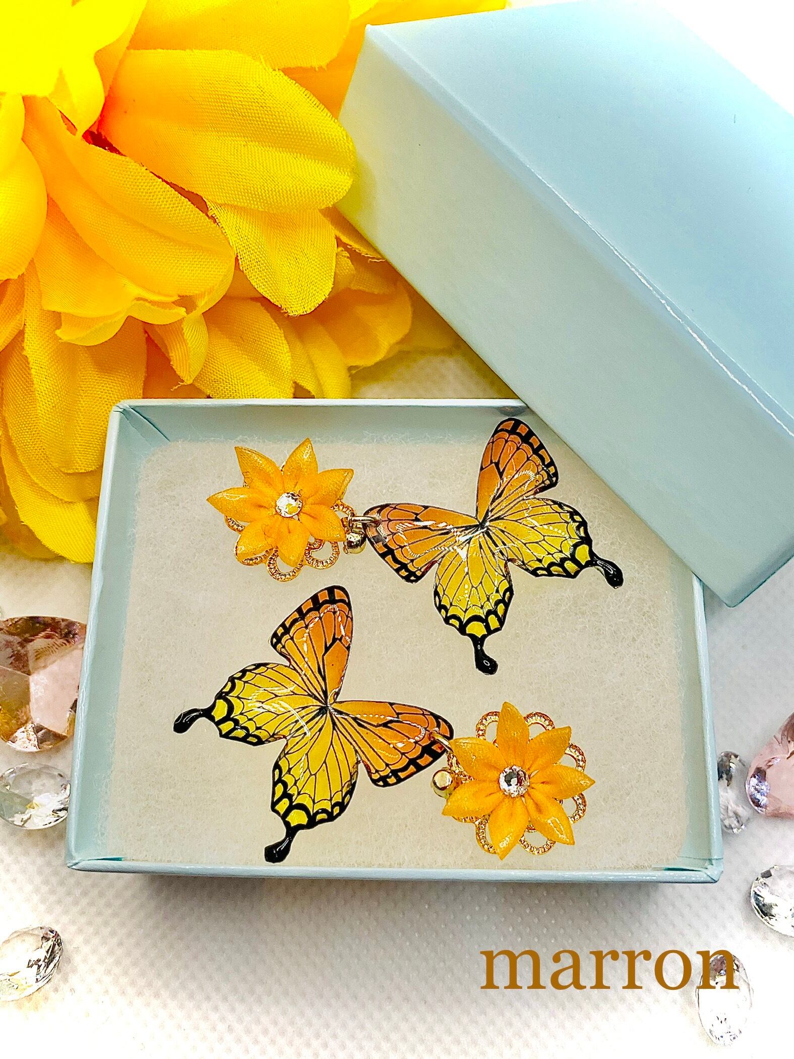 つまみ細工はレジンでコーティングしてありますので、型崩れすることなくご使用いただけます。